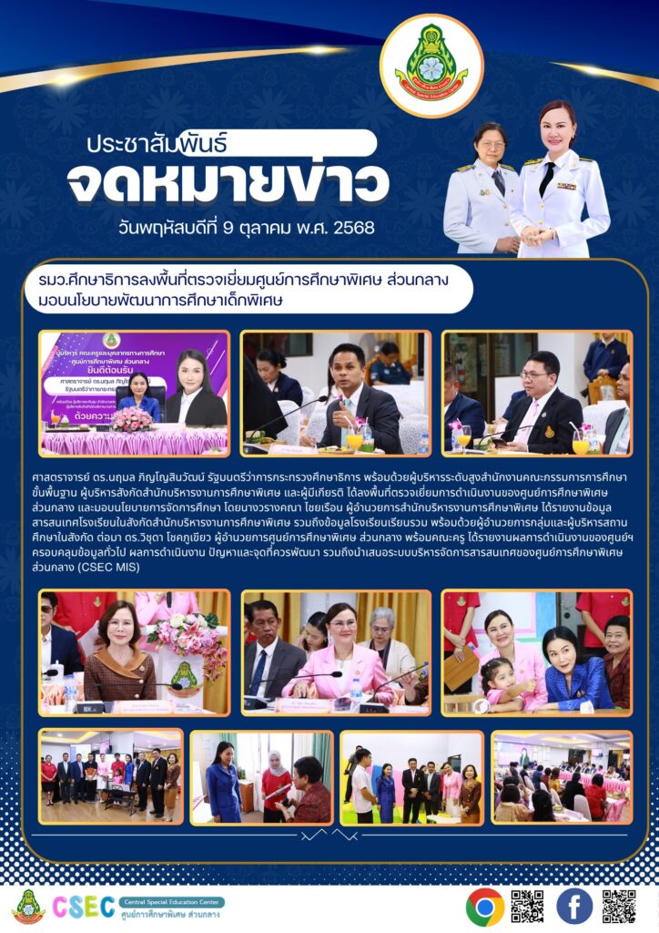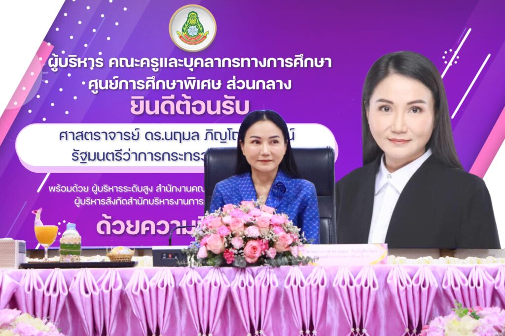 ศาสตราจารย์ ดร.นฤมล ภิญโญสินวัฒน์ รัฐมนตรีว่าการกระทรวงศึกษาธิการ พร้อมด้วยผู้บริหารระดับสูงสำนักงานคณะกรรมการการศึกษาขั้นพื้นฐาน ผู้บริหารสังกัดสำนักบริหารงานการศึกษาพิเศษ และผู้มีเกียรติ ได้ลงพื้นที่ตรวจเยี่ยมการดำเนินงานของศูนย์การศึกษาพิเศษ ส่วนกลาง และมอบนโยบายการจัดการศึกษา โดยนางวรางคณา ไชยเรือน ผู้อำนวยการสำนักบริหารงานการศึกษาพิเศษ ได้รายงานข้อมูลสารสนเทศโรงเรียนในสังกัดสำนักบริหารงานการศึกษาพิเศษ รวมถึงข้อมูลโรงเรียนเรียนรวม พร้อมด้วยผู้อำนวยการกลุ่มและผู้บริหารสถานศึกษาในสังกัด