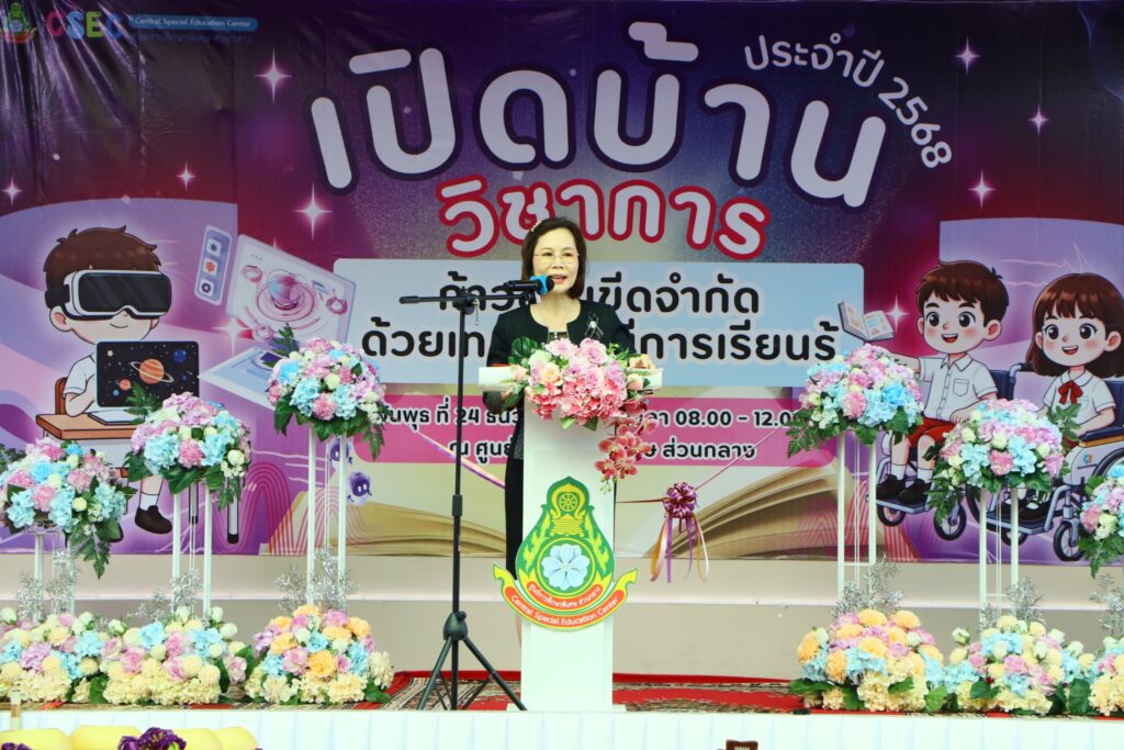 ศูนย์การศึกษาพิเศษ ส่วนกลาง ได้จัดงาน “เปิดบ้านวิชาการ ประจำปี 2568” ภายใต้แนวคิด “ก้าวข้ามขีดจำกัด ด้วยเทคโนโลยีการเรียนรู้” โดยได้รับเกียรติจาก นางวรางคณา ไชยเรือน ผู้อำนวยการสำนักบริหารงานการศึกษาพิเศษ เป็นประธานในพิธีเปิด และมี ดร.วิชุดา โชคภูเขียว ผู้อำนวยการศูนย์การศึกษาพิเศษ ส่วนกลาง เป็นผู้กล่าวรายงานวัตถุประสงค์การจัดงาน ซึ่งมุ่งเน้นการยกระดับคุณภาพการศึกษาสำหรับเด็กพิการผ่านนวัตกรรมสมัยใหม่
